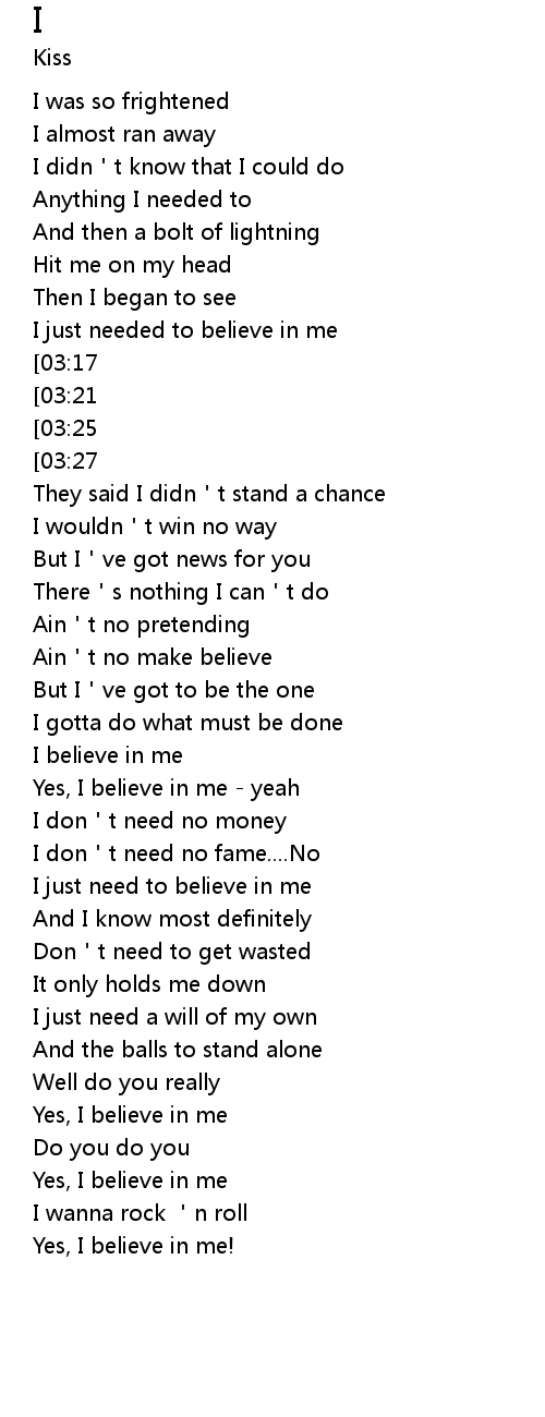 | [03:31][03:17][02:03][01:51][01:11][00:59] | Now I, I believe in me |