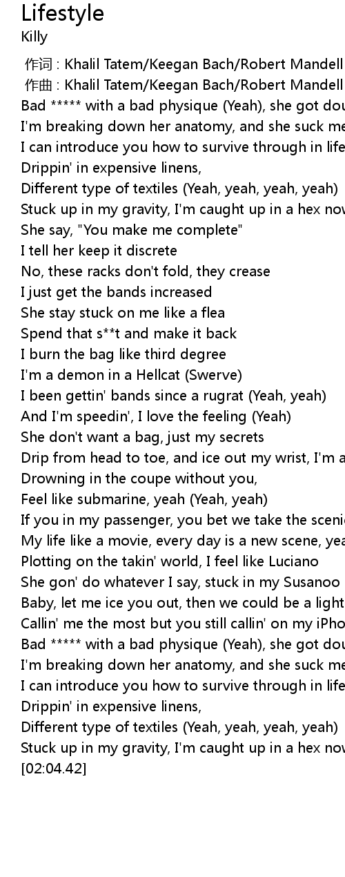 | [00:23.62] | Bad ***** with a bad physique (Yeah), she got double D's |