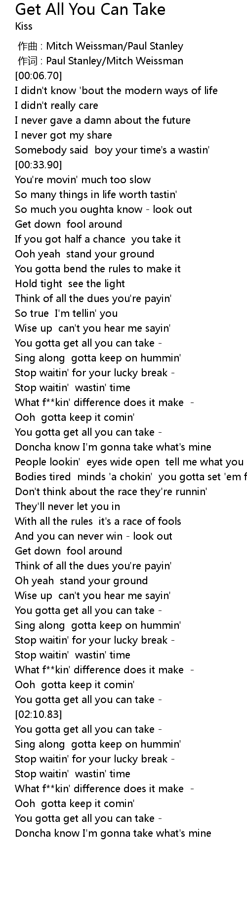 | [00:01.00] | 作词 : Paul Stanley/Mitch Weissman |