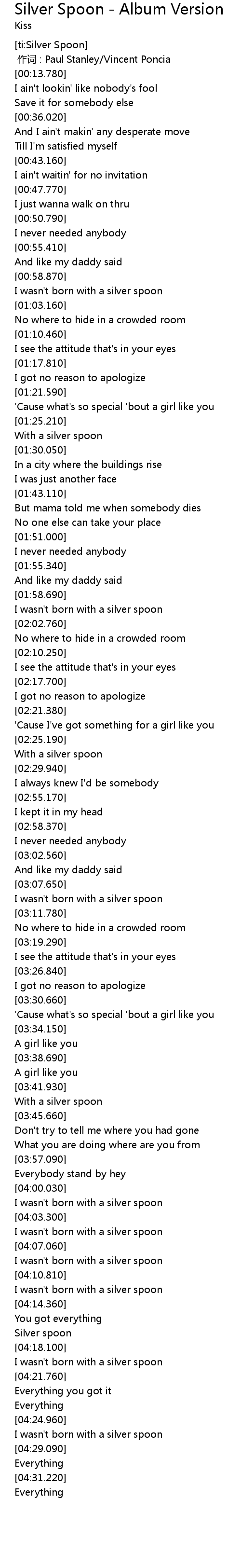 | [00:00.00] | 作词 : Paul Stanley/Vincent Poncia |