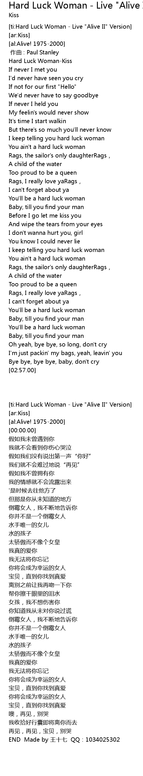 | [ti:Hard Luck Woman - Live "Alive II" Version] | |