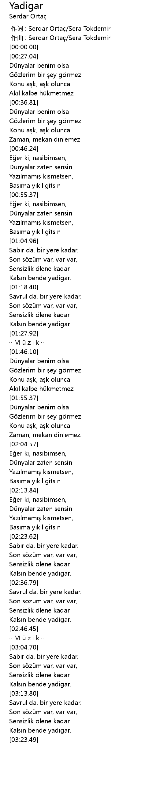 | [00:00.000] | 作词 : Serdar Ortaç/Sera Tokdemir |