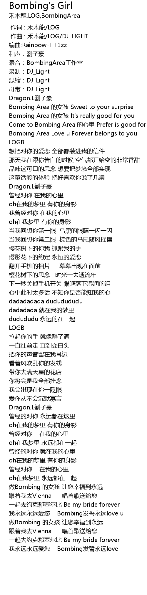 | [02:51.837] | wǒ yǒng yuǎn yǒng yuǎn ài nín Bombing fā shì yǒng yuǎn love u |