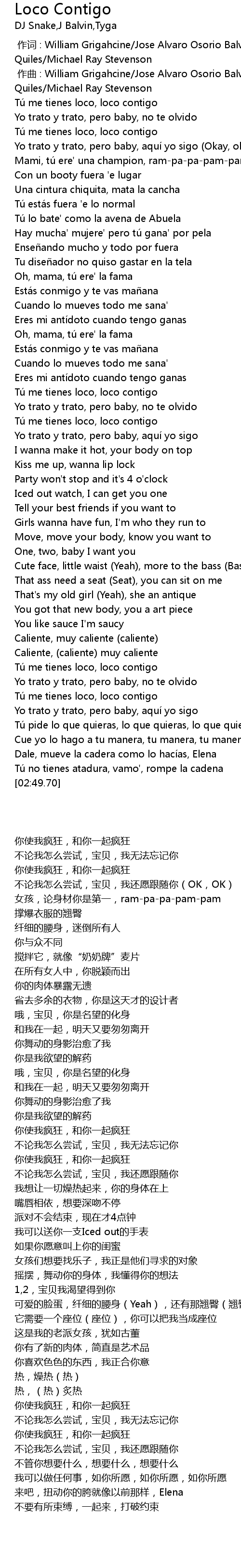| [02:10.23] | Tu me tienes loco, loco contigo |