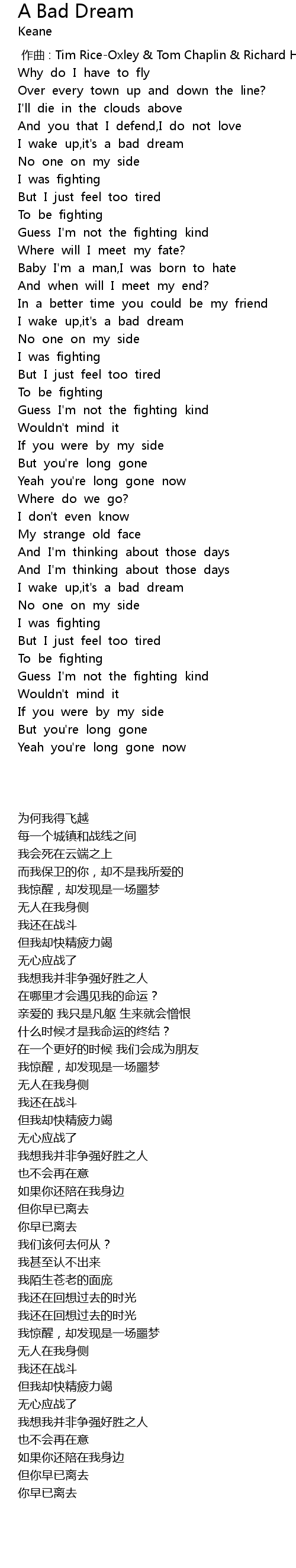 | [00:00.00] | zuò qǔ : Tim RiceOxley Tom Chaplin Richard Hughes |