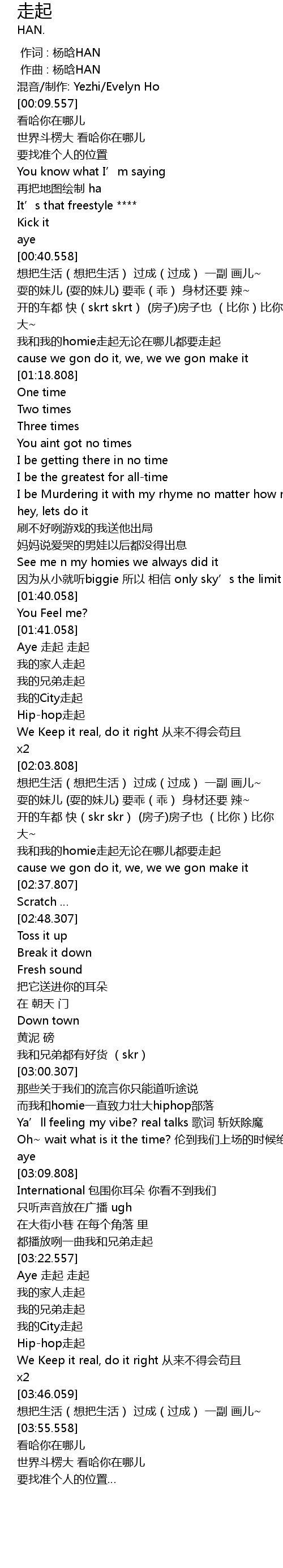 | [02:32.308] | wǒ hé wǒ de homie zǒu qǐ wú lùn zài nǎ ér dōu yào zǒu qǐ |