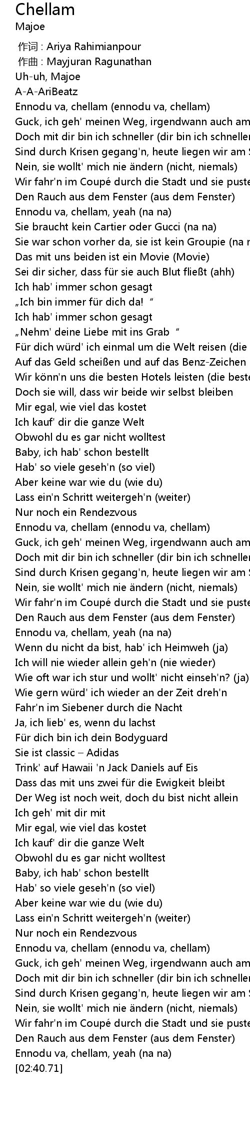 | [02:36.96] | Ennodu va, chellam, yeah (na na) |