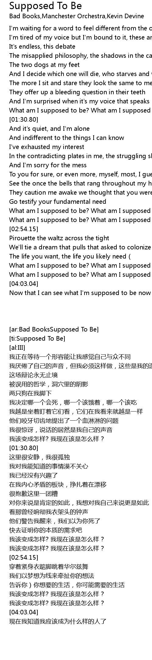 | [01:21.74] | What am I supposed to be? What am I supposed to be now? |