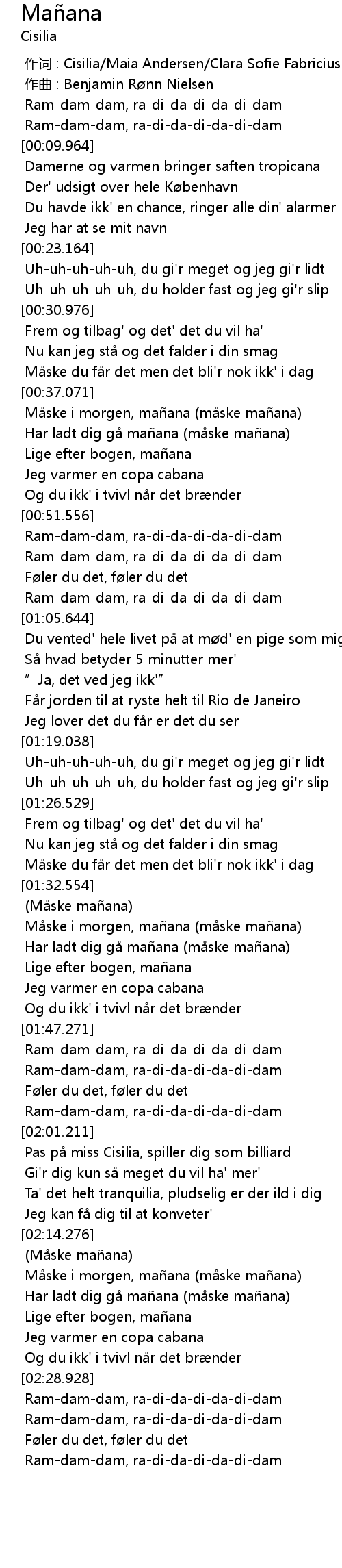 | [01:35.009] | Måske i morgen, mañana (måske mañana) |