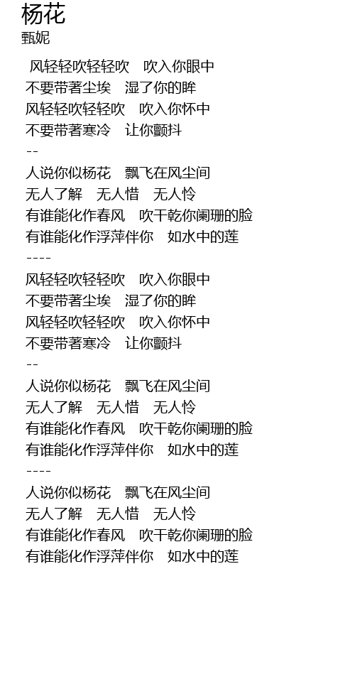 | rén shuō nǐ shì yáng huā piāo fēi zài fēng chén jiān | |