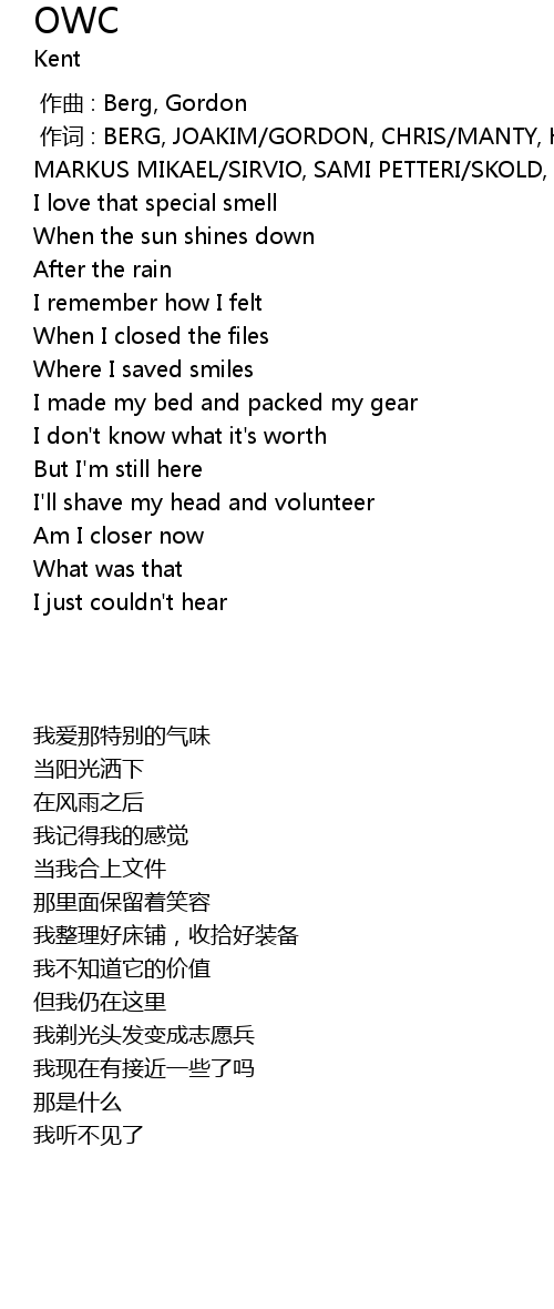 | [00:01.00] | zuò cí : BERG, JOAKIM GORDON, CHRIS MANTY, HARRI KALERVO MUSTONEN, MARKUS MIKAEL SIRVIO, SAMI PETTERI SKOLD, |