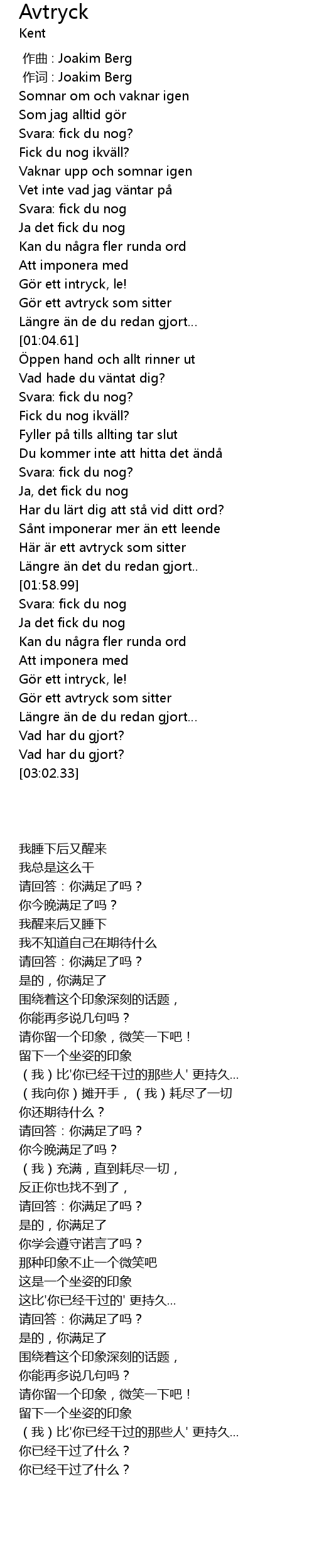 | [02:31.67] | Svara: fick du nog |