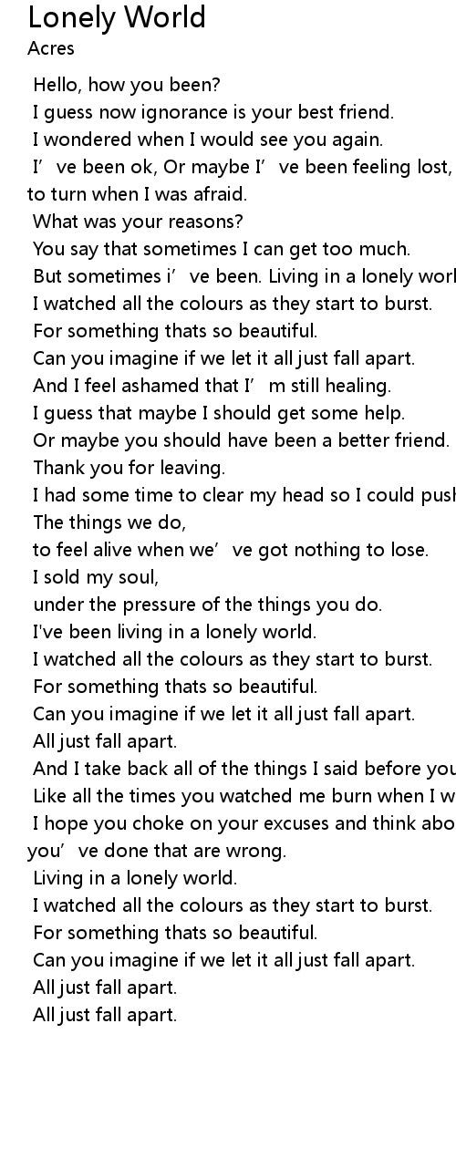 | [00:43.069] | But sometimes i' ve been. Living in a lonely world. |