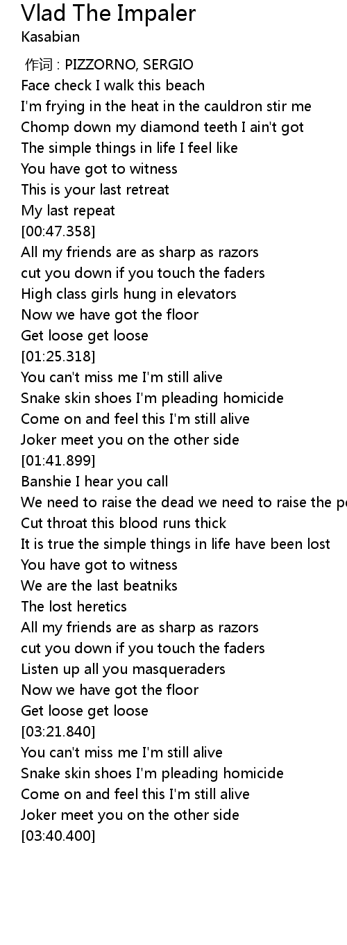 | [03:30.460] | Come on and feel this I' m still alive |