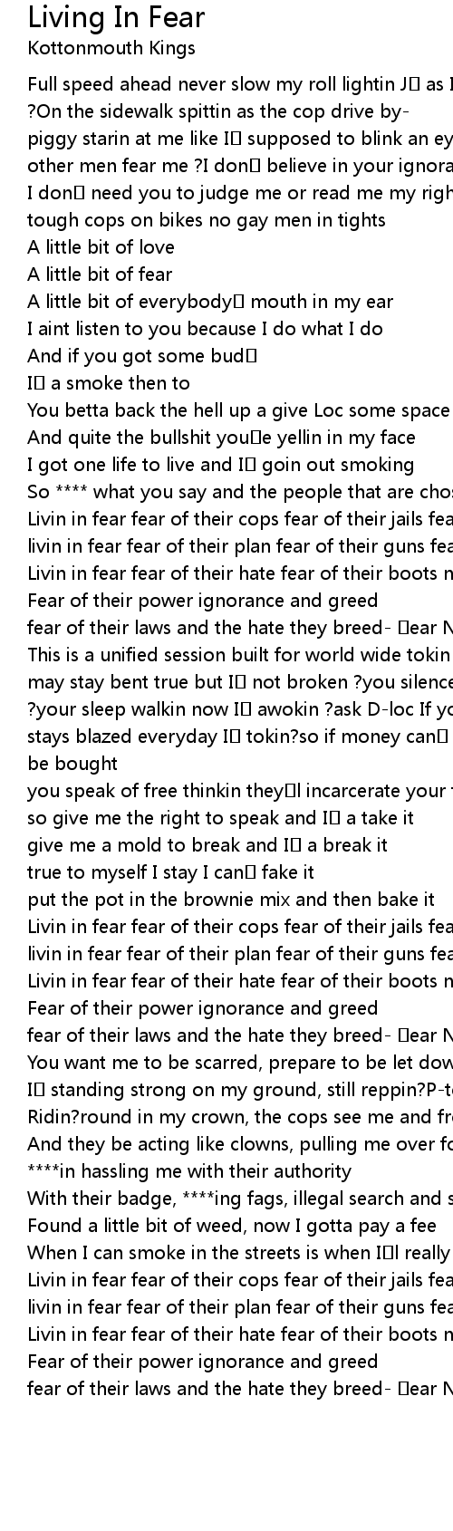 | Livin in fear fear of their hate fear of their boots night sticksnmace | |