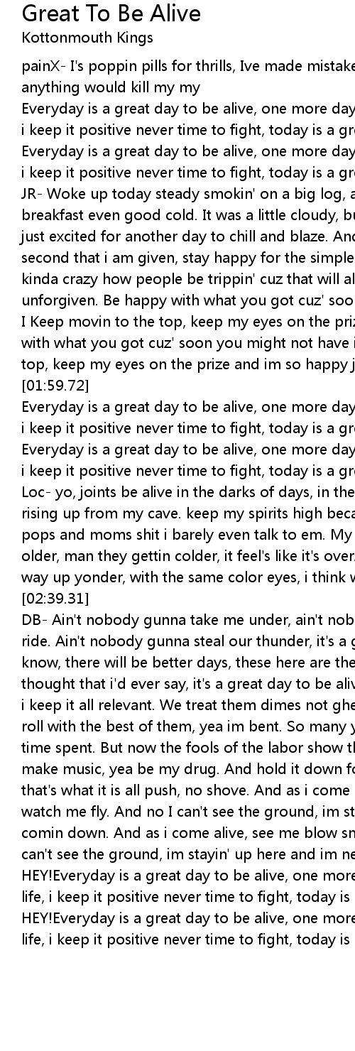 Everyday is a great day to be alive, one more day get to live my life, i keep it positive never time to fight, today is a great day be to alive. |