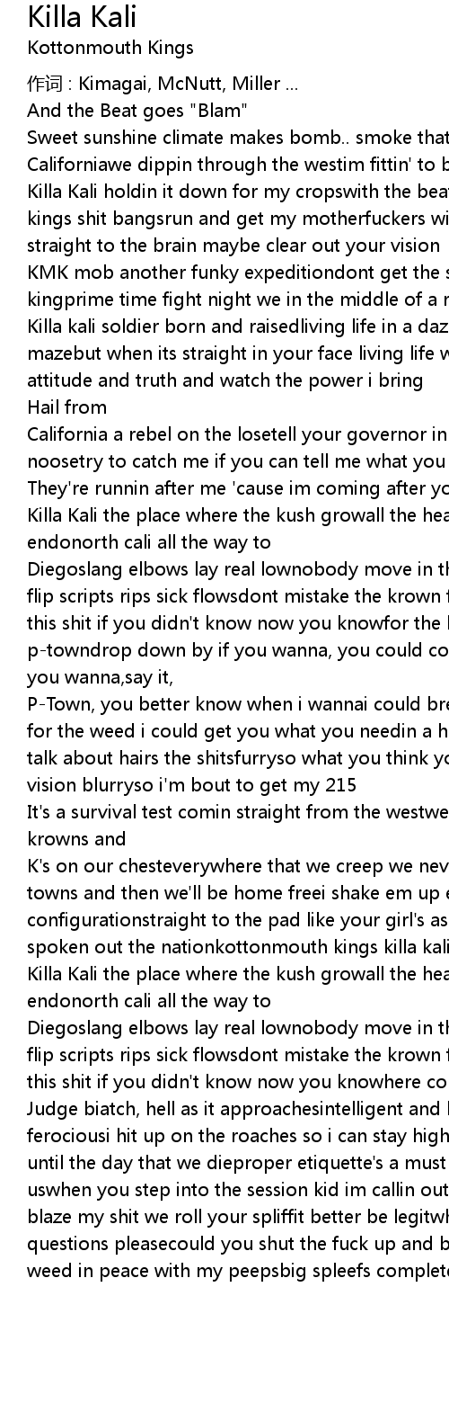 | Killa Kali holdin it down for my cropswith the beats that knock you know the kings shit bangsrun and get my motherfuckers with the insane straintake it straight to the brain maybe clear out your vision | |