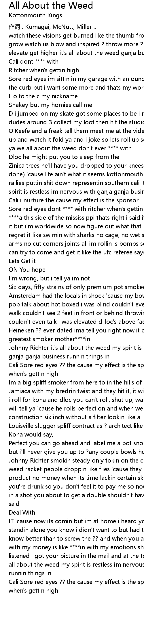 | watch these visions get burned like the thumb from my lighter the tighter we grow watch us blow and inspired ? throw more ? on the fire kottonmouth kings elevate get higher it's all about the weed ganja business runnin things in | |