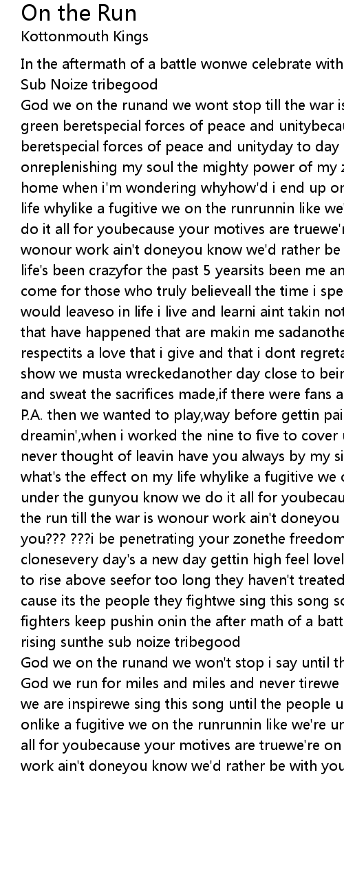 God we on the runand we wont stop till the war is wonbecause we strong like a green beretspecial forces of peace and unitybecause we strong like a green beretspecial forces of peace and unityday to day song to song the battle rages onreplenishing my soul the mighty power of my zongwhen i'm thinking bout back home when i'm wondering whyhow'd i end up on the road what's the effect on my life whylike a fugitive we on the runrunnin like we're under the gunyou know we do it all for youbecause your motives are truewe're on the run till the war is wonour work ain't doneyou know we'd rather be with youon the road doin showsmy life's been crazyfor the past 5 yearsits been me and my ladyonly good things come for those who truly believeall the time i spent alone i never thought i would leaveso in life i live and learni aint takin nothin backwith the things that have happened that are makin me sadanother day goes by gotta show respectits a love that i give and that i dont regretanother town down another show we musta wreckedanother day close to being home i get,with the tears blood and sweat the sacrifices made,if there were fans and a |