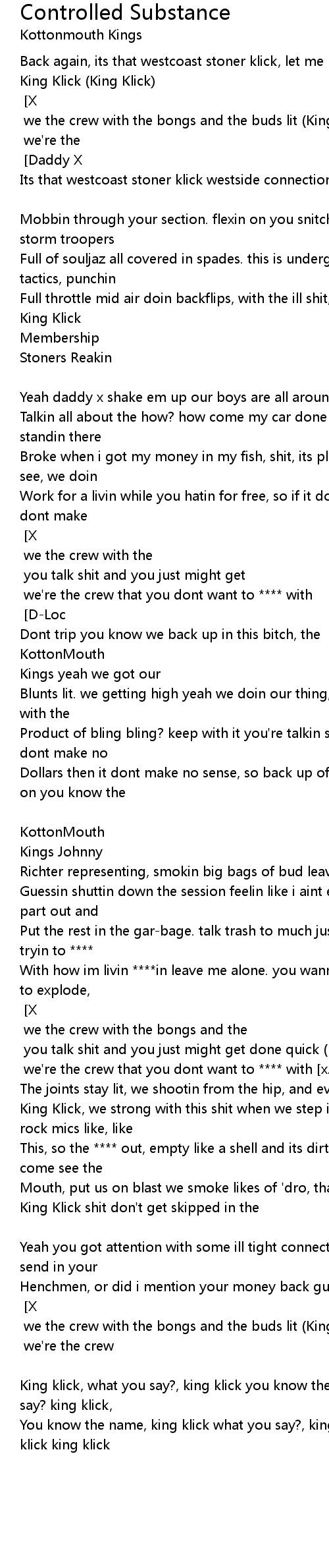 Pickin up all the pieces get the gun and reload. [Hook] [X] we come through yes we control the substance (King Klick) [JR] we the crew with the bongs and the buds lit (King Klick) [D] you talk shit and you just might get done quick (King Klick) [ALL] we're the crew that you dont want to **** with [x2] [DL] |