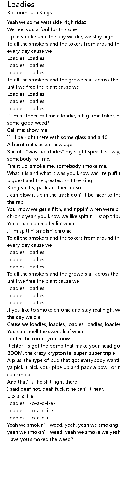 | I’m a stoner call me a loadie, a big time toker, high times roadie, you got some good weed? | |