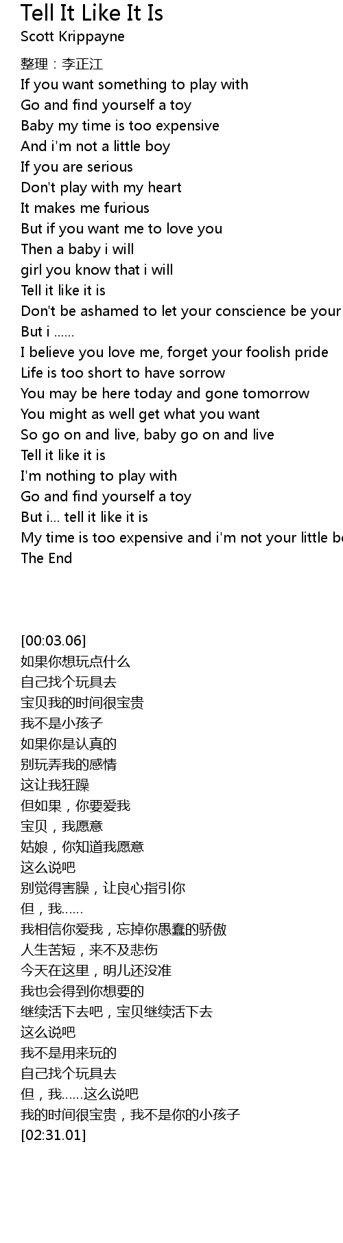 | [02:06.68] | Tell it like it is |