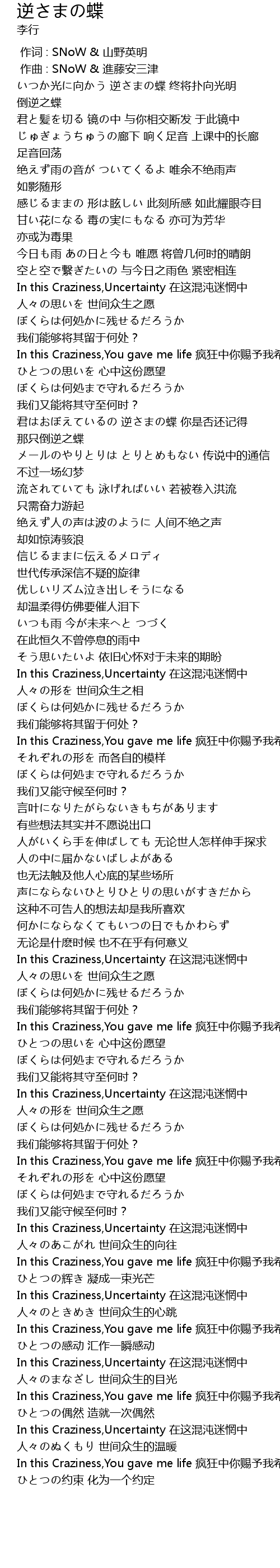 | [00:11.132] | いつか光に向かう 逆さまの蝶 终将扑向光明 倒逆之蝶 |