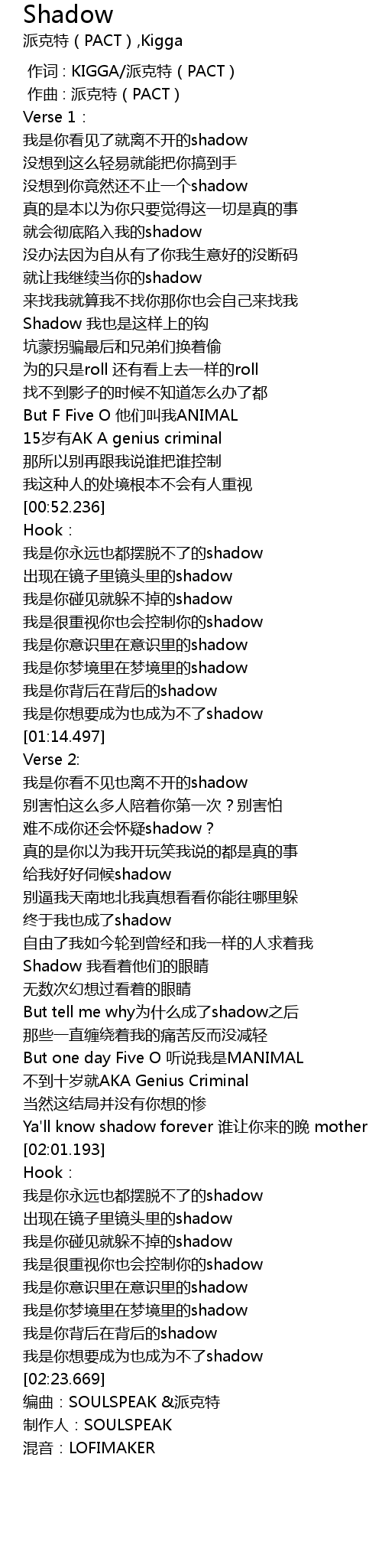 | [01:58.312] | Ya'll know shadow forever 谁让你来的晚 mother |