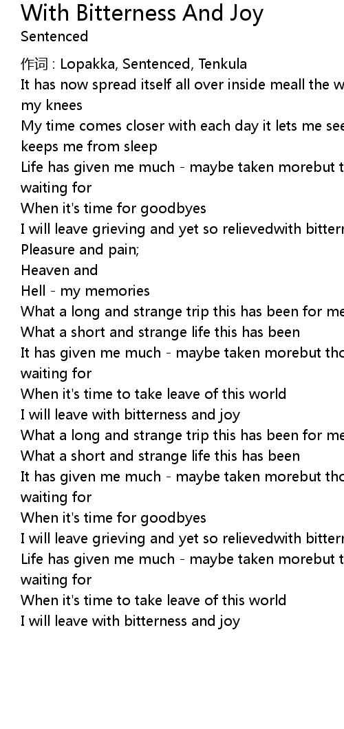 | I will leave grieving and yet so relievedwith bitterness and joy | |