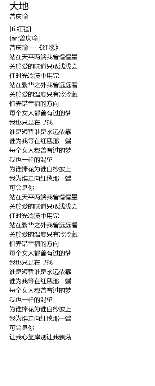 | [00:00.70] | 曾庆瑜---《红毯》 |