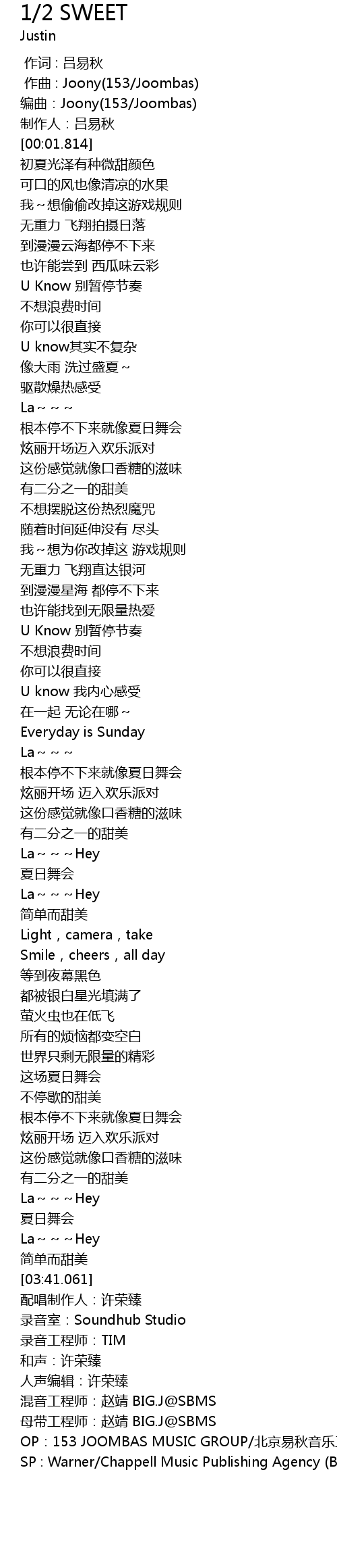 | [03:43.290] | OP:153 JOOMBAS MUSIC GROUP/北京易秋音乐工作室 |