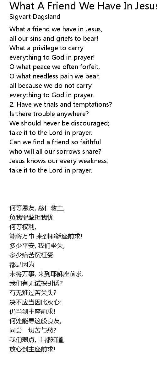 What a friend we have in Jesus, |