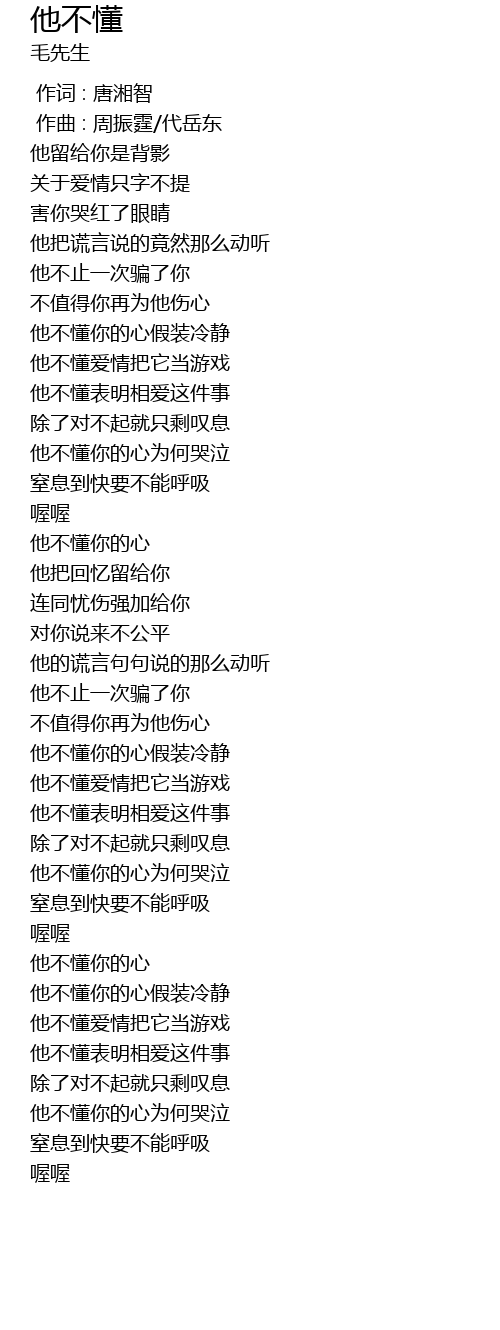 | [03:12.296] | 他不懂你的心为何哭泣 |