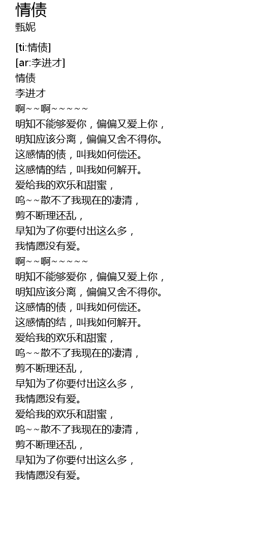 | [01:43.356] | 这感情的债,叫我如何偿还。 |