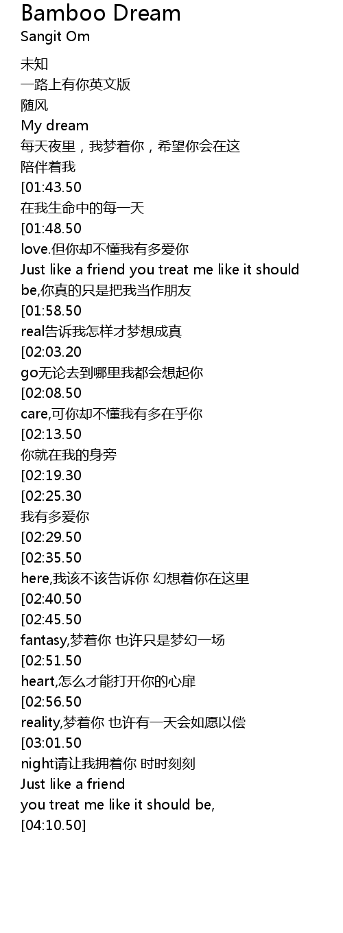 | [00:10.50][01:43.50] | I dream of you everyday of my life, meng zhe ni zai wo sheng ming zhong de mei yi tian |