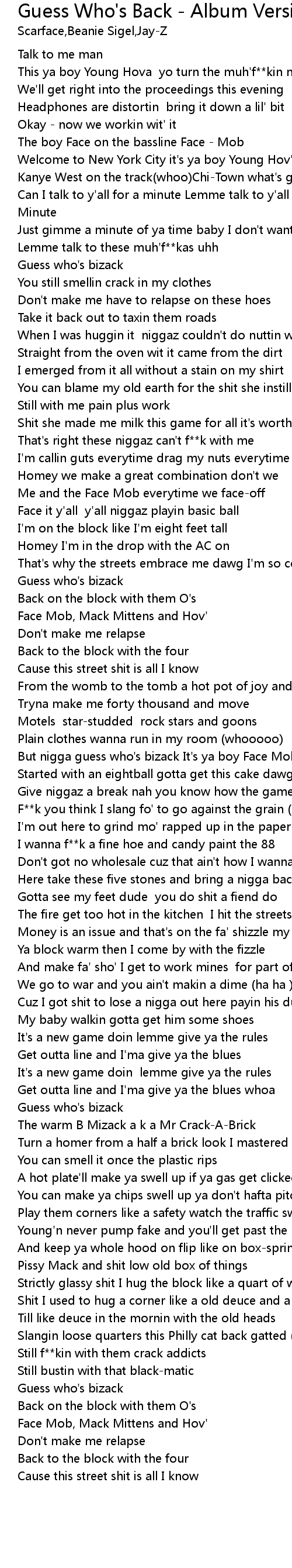 | [01:51.81] | But nigga guess who's bizack It's ya boy Face Mob |