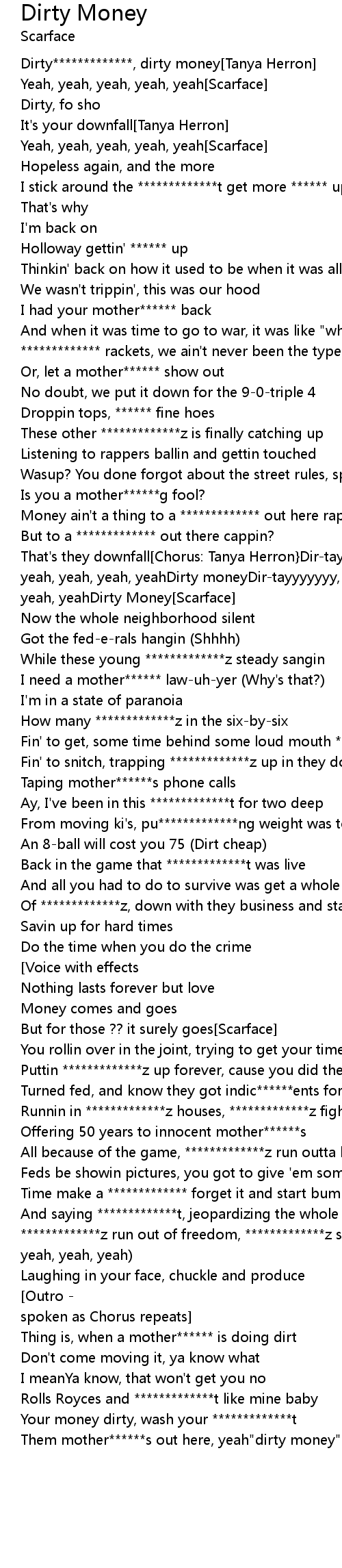 That's they downfall[Chorus: Tanya Herron}Dir-tayyyyy, yeahDirty moneyYeah, yeah, yeah, yeah, yeahDirty moneyDir-tayyyyyyy, yeahDirty moneyYeah, yeah, yeah, yeah, yeahDirty Money[Scarface] |
