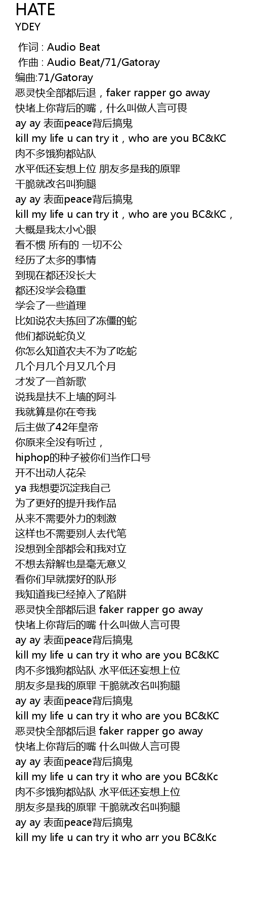 | [00:37.985] | kill my life u can try it,who are you BC&KC, |