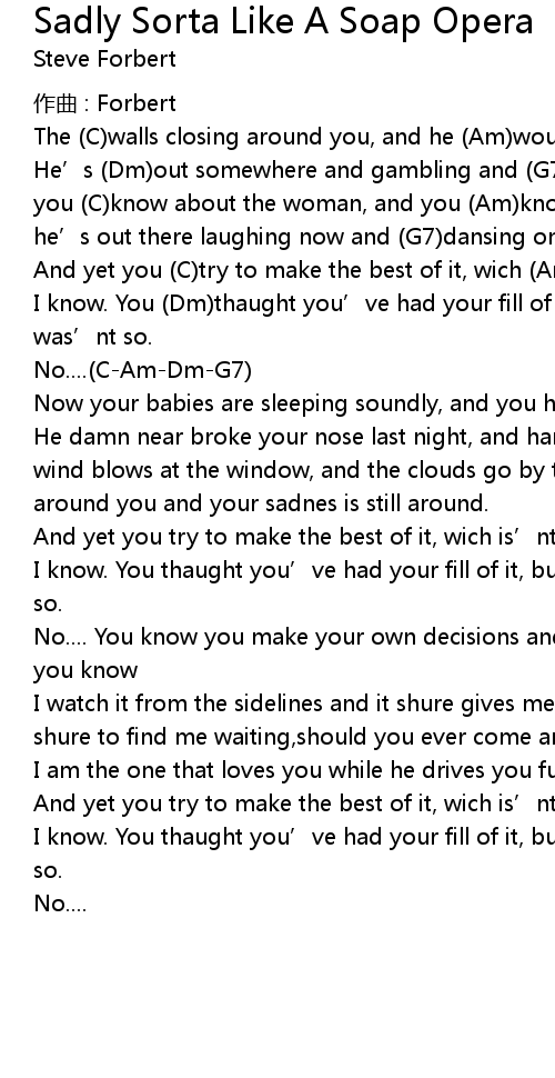 | He' s Dm out somewhere and gambling and G7 perhaps he' s in a fight, and yes you C know about the woman, and you Am know its three or four, and DM perhaps he' s out there laughing now and G7 dansing on the floor. | |