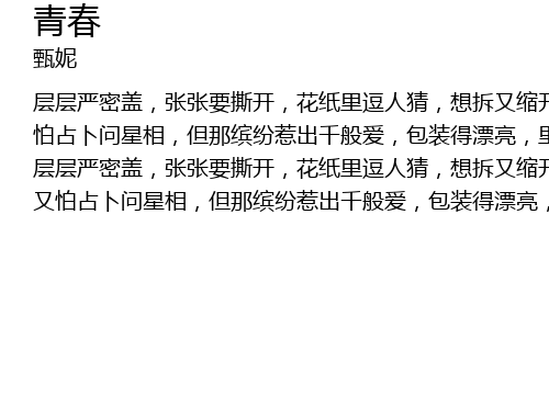 | 又怕占卜问星相,但那缤纷惹出千般爱,包装得漂亮,里面却遮盖,下了决心定要知真相,将礼物花纸拆掉,原来青春不再,将礼物花纸拆掉,原来青春不再。 |