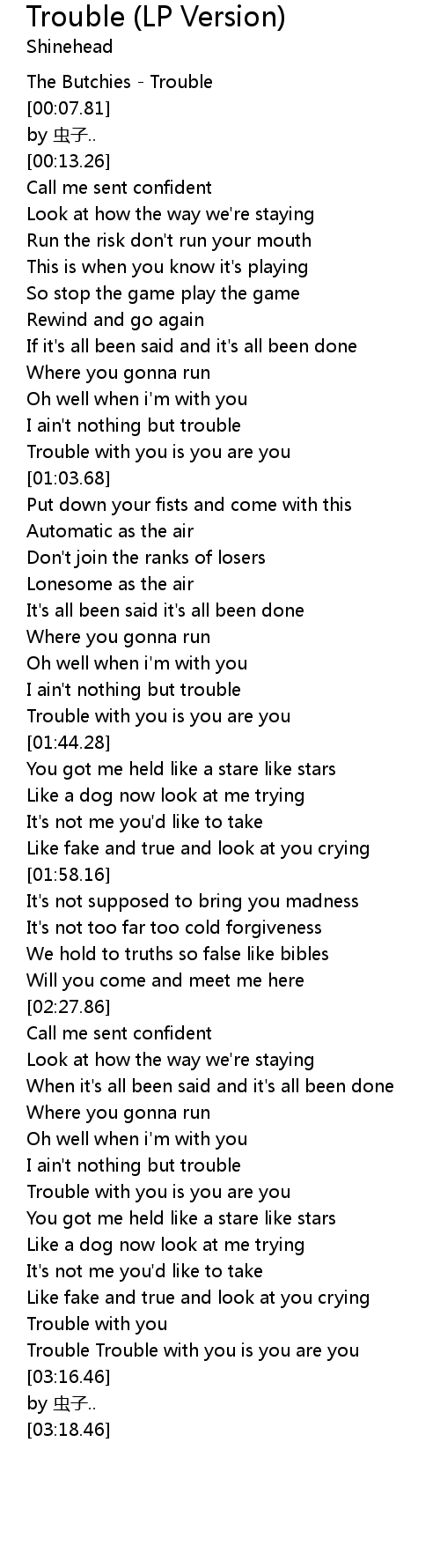 | [03:10.53] | Trouble Trouble with you is you are you |
