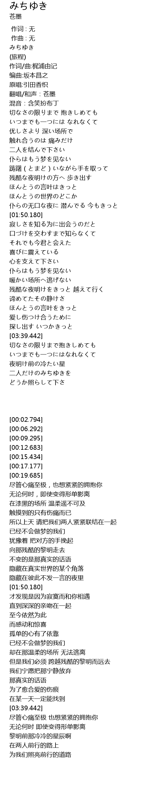 | [03:59.595] | 切なさの限りまで抱きしめても |