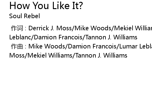 | [00:00.00-1] | 作曲 : Mike Woods/Damion Francois/Lumar Leblanc/Derrick J. Moss/Mekiel Williams/Tannon J. Williams |