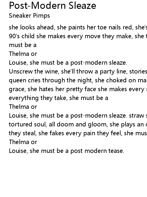 Louise, she must be a post-modern sleaze. straw spun from gold, she craves a tortured soul, all doom and gloom, she plays an open wound, she takes everything they steal, she fakes every pain they feel, she must be a |