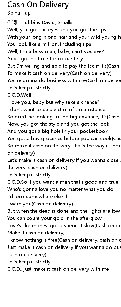 | So make it cash on delivery, that' s the way it should be Cash on delivery, cash on delivery | |