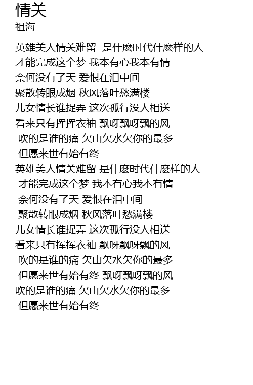 | [01:15.59] | 奈何没有了天 爱恨在泪中间 |