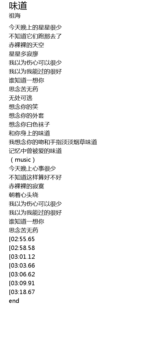 | [03:39.19][03:09.91] | 我想念你的吻和手指淡淡烟草味道 |