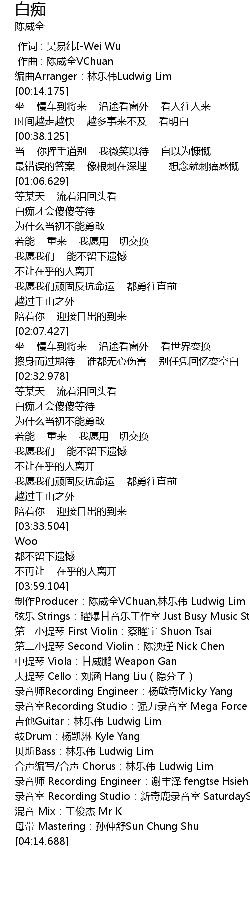 | [04:01.052] | zhi zuo Producer: chen wei quan VChuan, lin le wei Ludwig Lim |