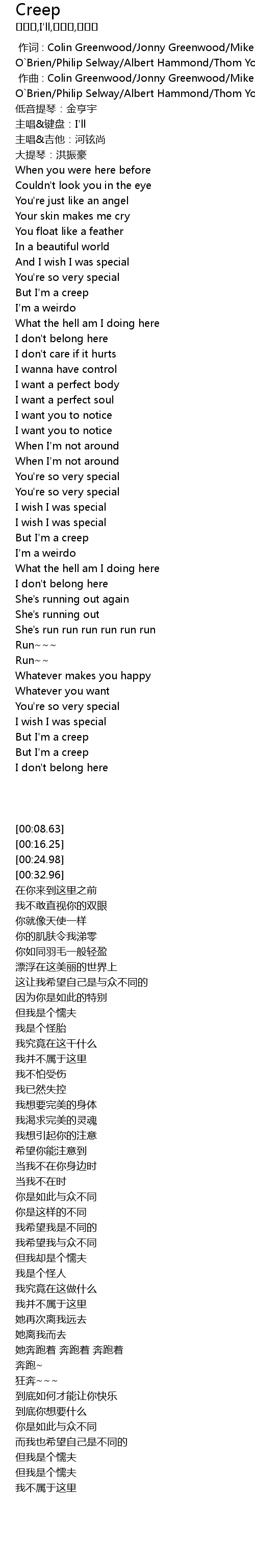 | [00:01.000] | 作曲 : Colin Greenwood/Jonny Greenwood/Mike Hazlewood/Ed O`Brien/Philip Selway/Albert Hammond/Thom Yorke |