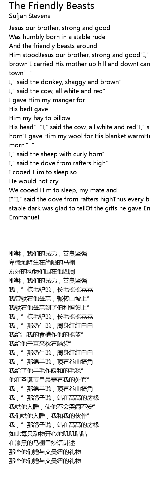 | I"" I," said the dove from rafters highThus every beast by some good spellIn the stable dark was glad to tellOf the gifts he gave EmmanuelOf the gifts he gave Emmanuel |
